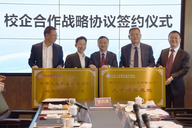 隨后,貴州洪山投資控股有限公司董事長金烈森和學(xué)院院長邱國援簽訂了校企合作戰(zhàn)略協(xié)議書,并完成授牌儀式。