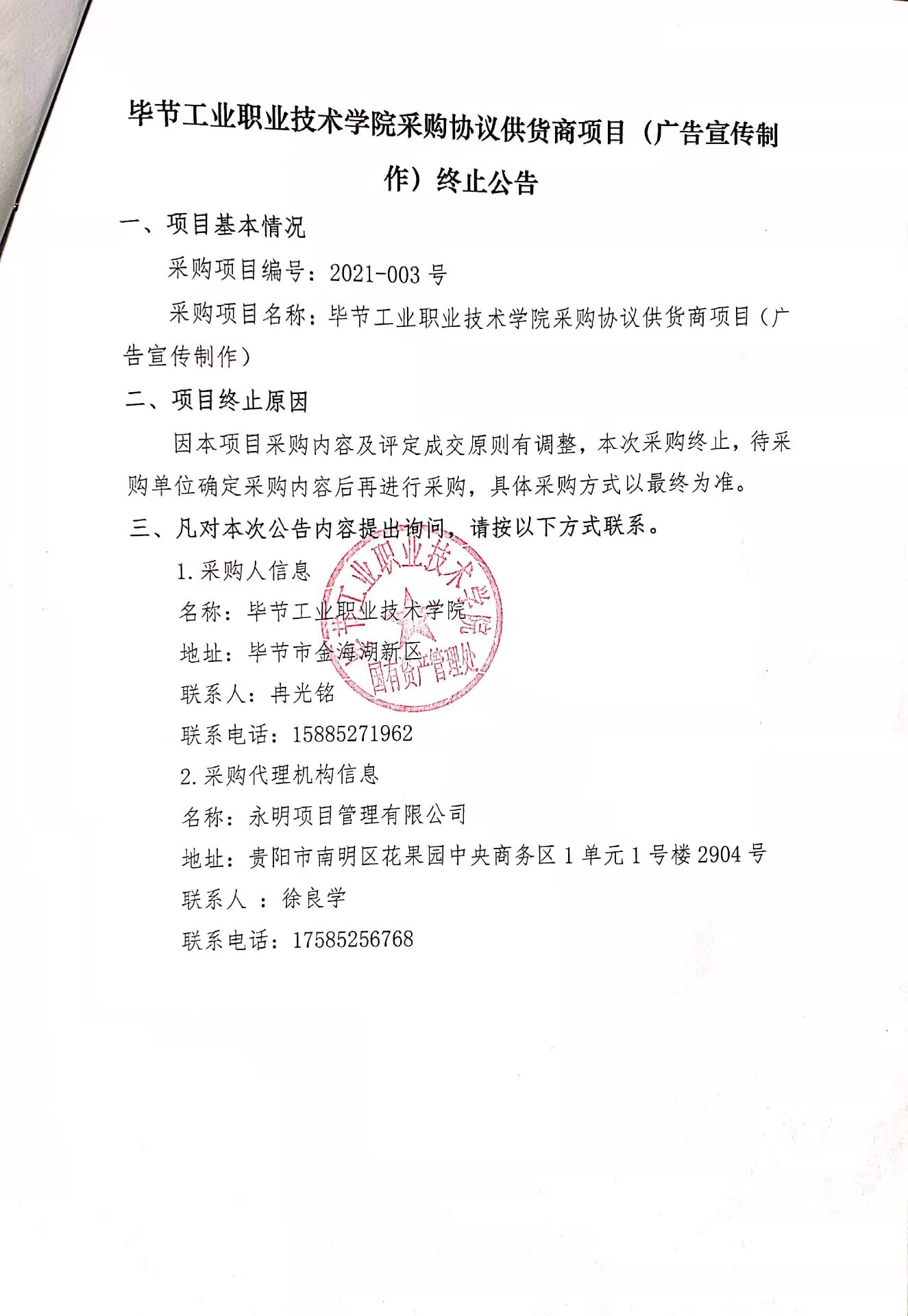 畢節(jié)工業(yè)職業(yè)技術(shù)學(xué)院采購(gòu)協(xié)議供貨商項(xiàng)目(廣告宣傳制作)終止公告