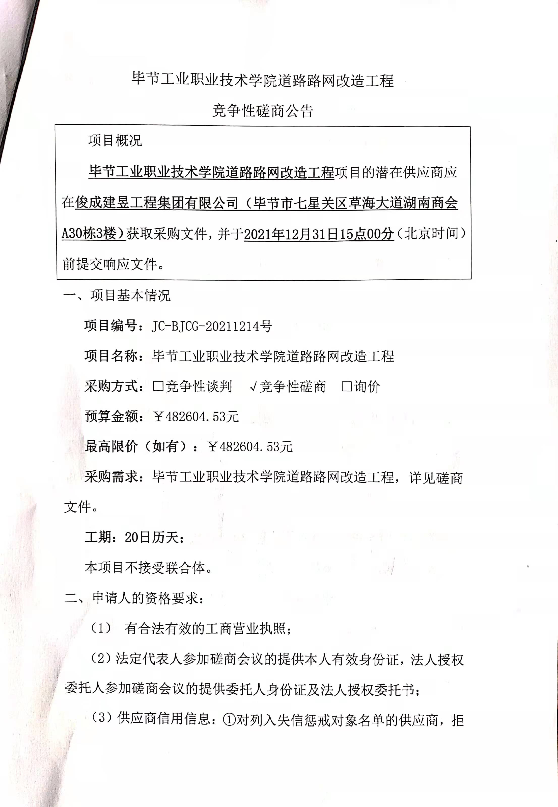 畢節(jié)工業(yè)職業(yè)技術(shù)學(xué)院道路路網(wǎng)改造工程競(jìng)爭(zhēng)性磋商公告