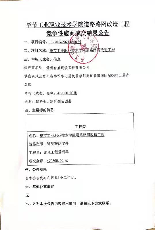 畢節(jié)工業(yè)職業(yè)技術學院道路路網(wǎng)改造工程競爭性磋商成交結果公告