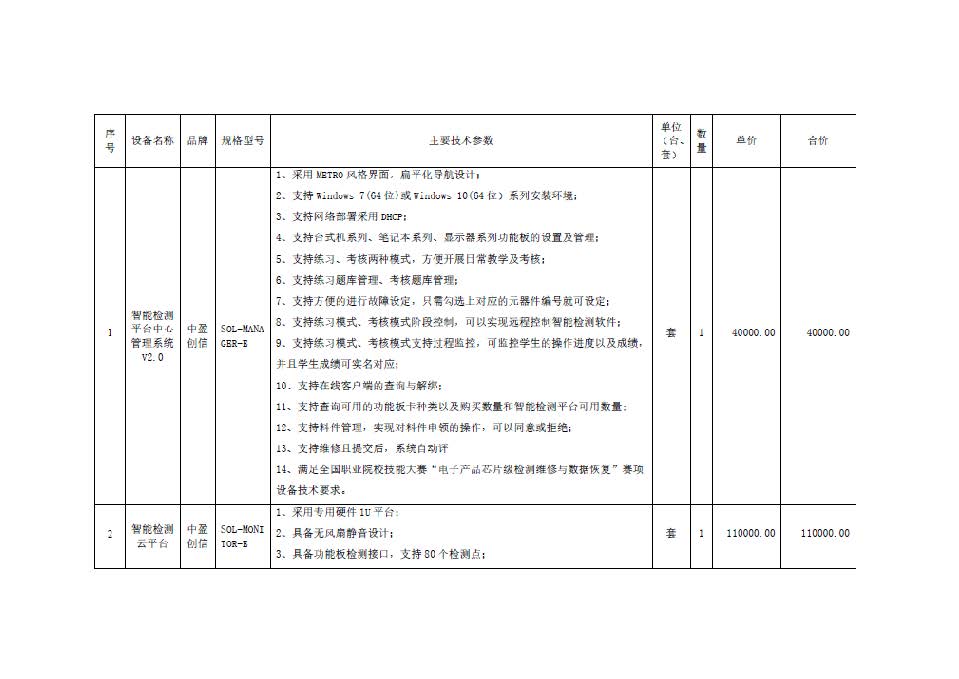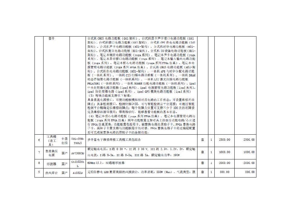 標(biāo)的名稱:計(jì)算機(jī)硬件檢測(cè)及數(shù)據(jù)恢復(fù)實(shí)訓(xùn)、技能大賽設(shè)備購(gòu)置 品牌:詳見(jiàn)附件。 規(guī)格型號(hào):詳見(jiàn)附件。 數(shù)量:詳見(jiàn)附件 單價(jià):詳見(jiàn)附件(此單價(jià)為中標(biāo)供應(yīng)商的基礎(chǔ)報(bào)價(jià)) 服務(wù)要求:按國(guó)家現(xiàn)行的相關(guān)規(guī)范、標(biāo)準(zhǔn)以及采購(gòu)項(xiàng)目的實(shí)際需求20日歷天完成本項(xiàng)目的供貨及安裝等要求,符合采購(gòu)人使用要求。 |