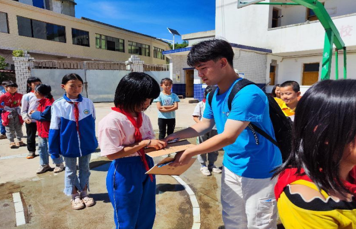 圖為實(shí)踐隊(duì)成員給小朋友送上學(xué)習(xí)用品