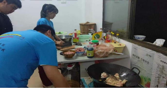 在沙灣村村委的極力支持下,實(shí)踐團(tuán)隊(duì)打地鋪、四支團(tuán)隊(duì)輪流進(jìn)行外出采買物資,做飯。