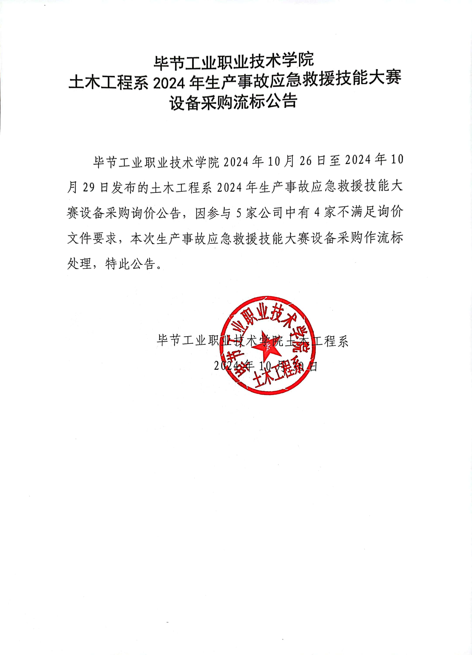 畢節(jié)工業(yè)職業(yè)技術(shù)學院土木工程系2024年生產(chǎn)事故應急救援技能大賽設備采購流標公告
