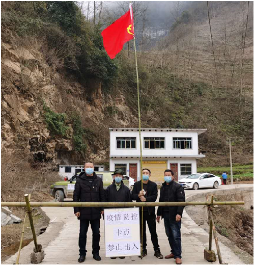(圖2:畢節(jié)工職院派駐青山村第一書記趙澤龍帶領(lǐng)村干部在青山村卡點開展防控值守)